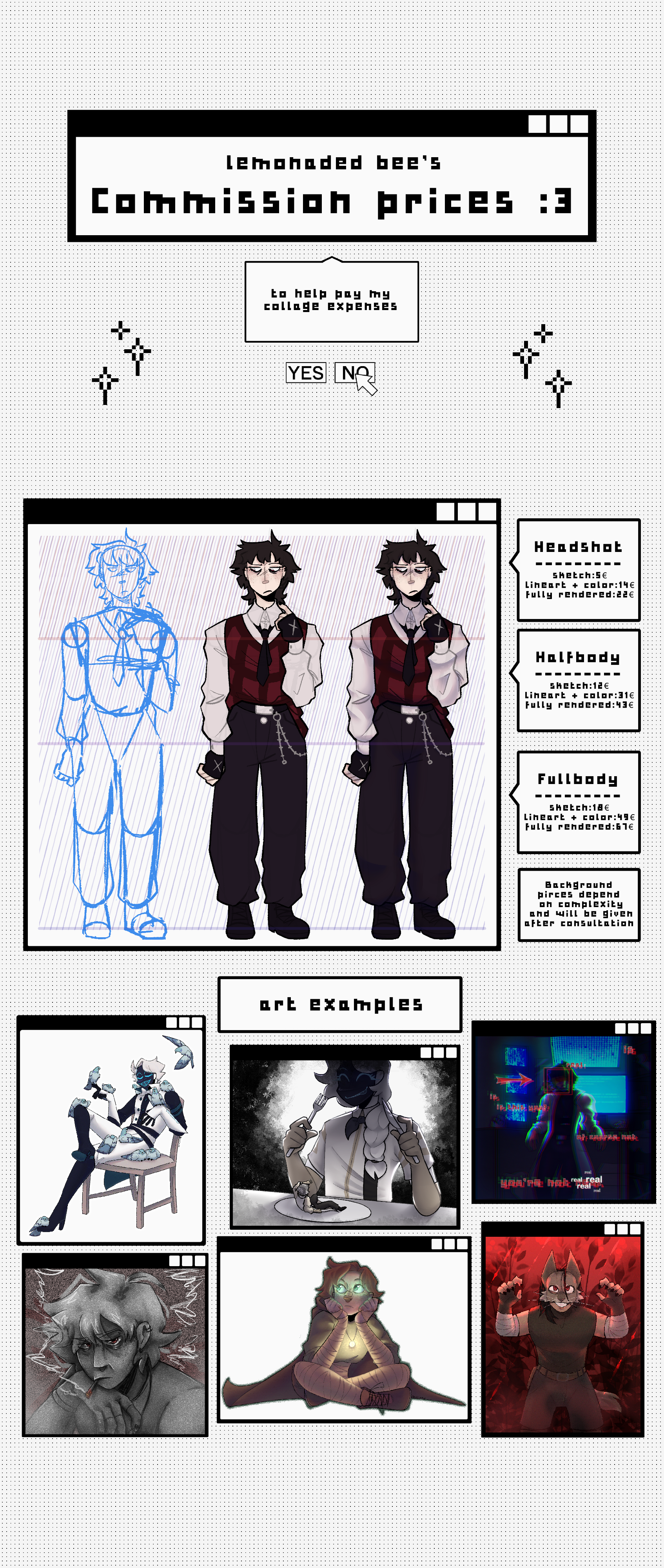 if you're interested you can DM me here or send me an email on beelemonade.bussiness@gmail.com or check out on my ko-fi.. also i made a persona specifically made for my commission work.