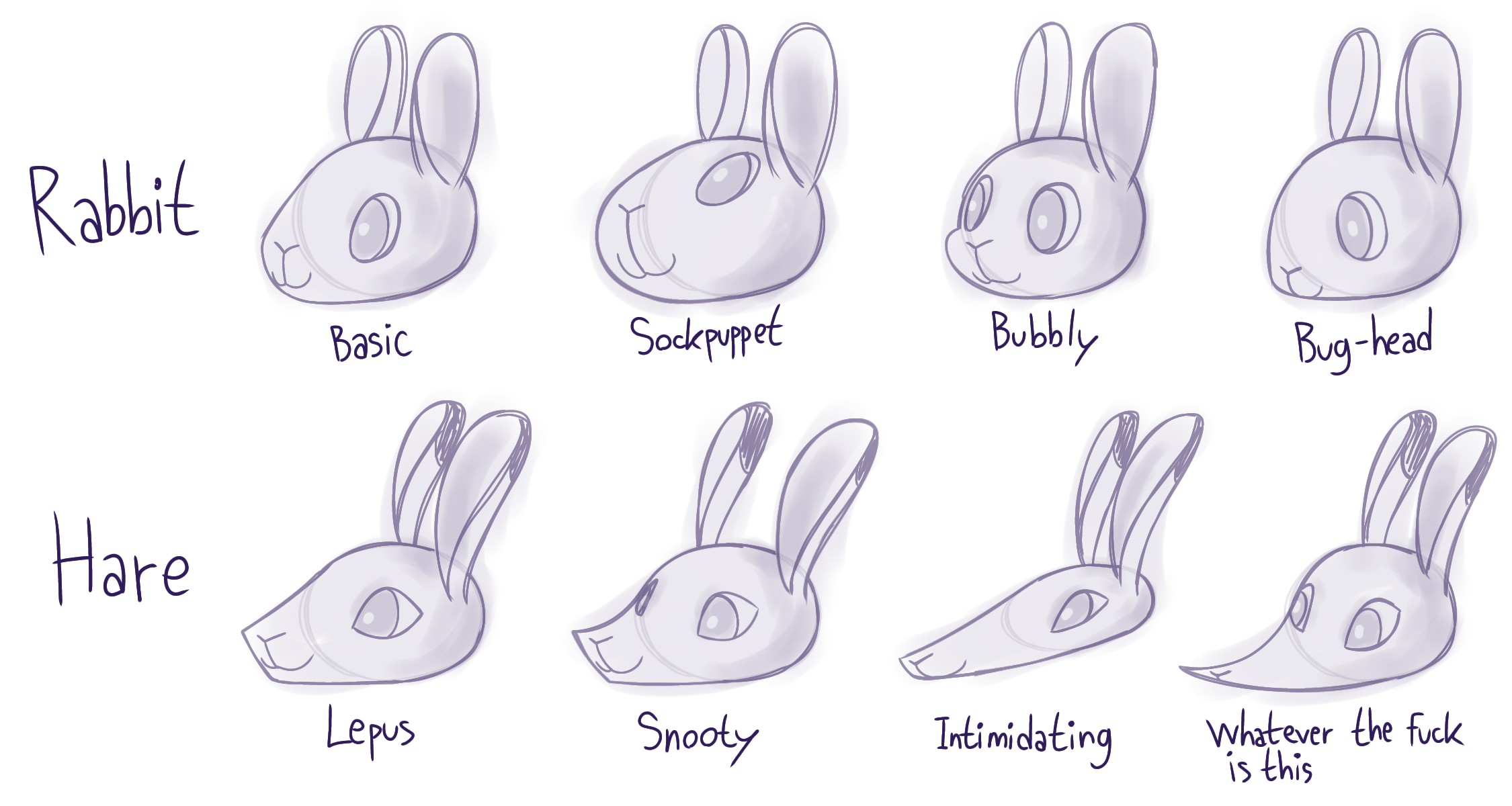 I drew these because I'm bored and I want to give my bunny OCs unique head shape depending on their aesthetic. I don't feel like posting this as a new artwork, since I'm not comfortable with posting any of my simple doodles as one. <:'(