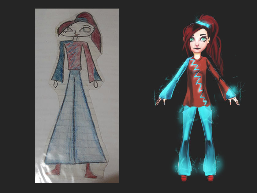 On the left is my very first drawing of her—I think I did it when I was twelve. On the right is the 'upgraded' version, where I was experimenting with different styles.