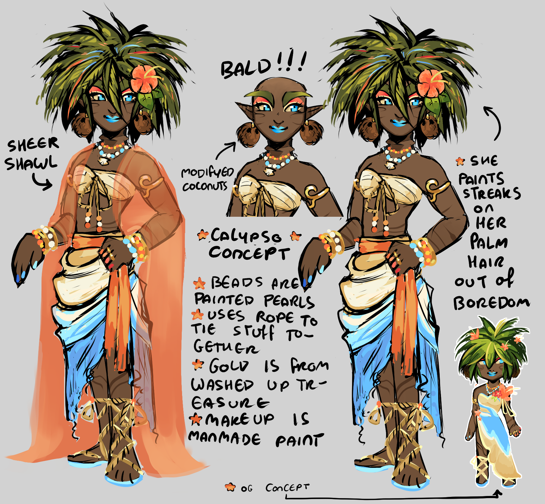 And as a bonus, have Calypso's current Hades fan-design concept! The small little "original concept" at the bottom was what was used for the animatic, + some traditional doodles (bc of this, u can see her design shift a little in the animatic itself!)
