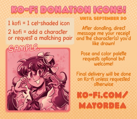 hello world!! i'm back to announce that i'll be doing some quick icon commissions over on kofi for one tip (5 USD) :D this offer lasts until the end of september! come and get 'em!!!