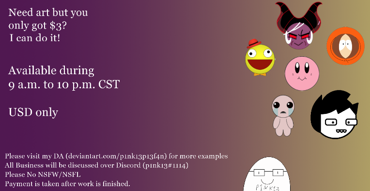 All business must be discussed on Discord (p1nk13#1114), I have no time limit. I am available between 9 A.M. to 10 P.M. CST. Please check my galleries on DA or NG for examples!