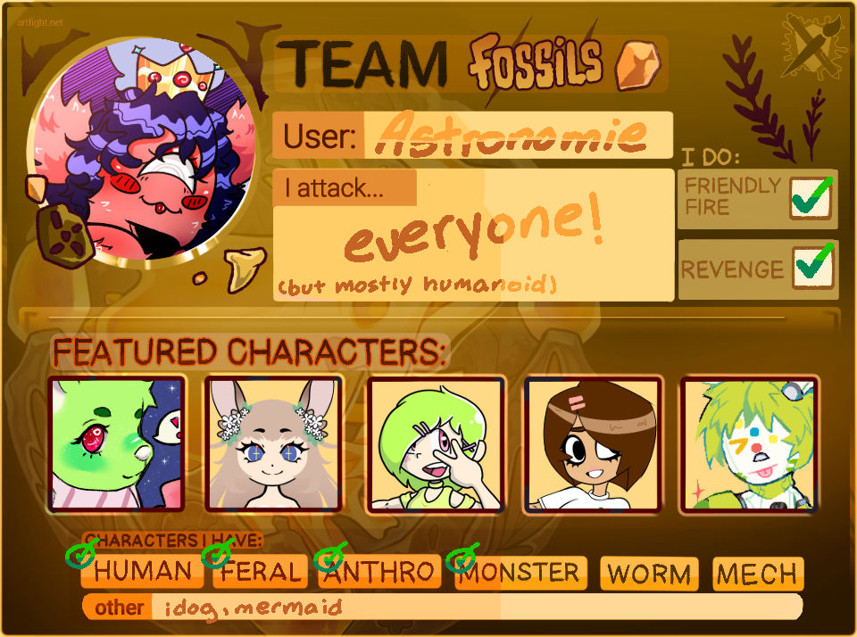 HELLO!!!! I haven't been as active as I'd like because uni is kicking my ass. But I have decided to participate in Artfight again this year!! I'm team Fossils! I'm gonna try a new style that seems a lor faster but still fun to do. If anyone wants to be mutuals there, my @ is Astronomie!